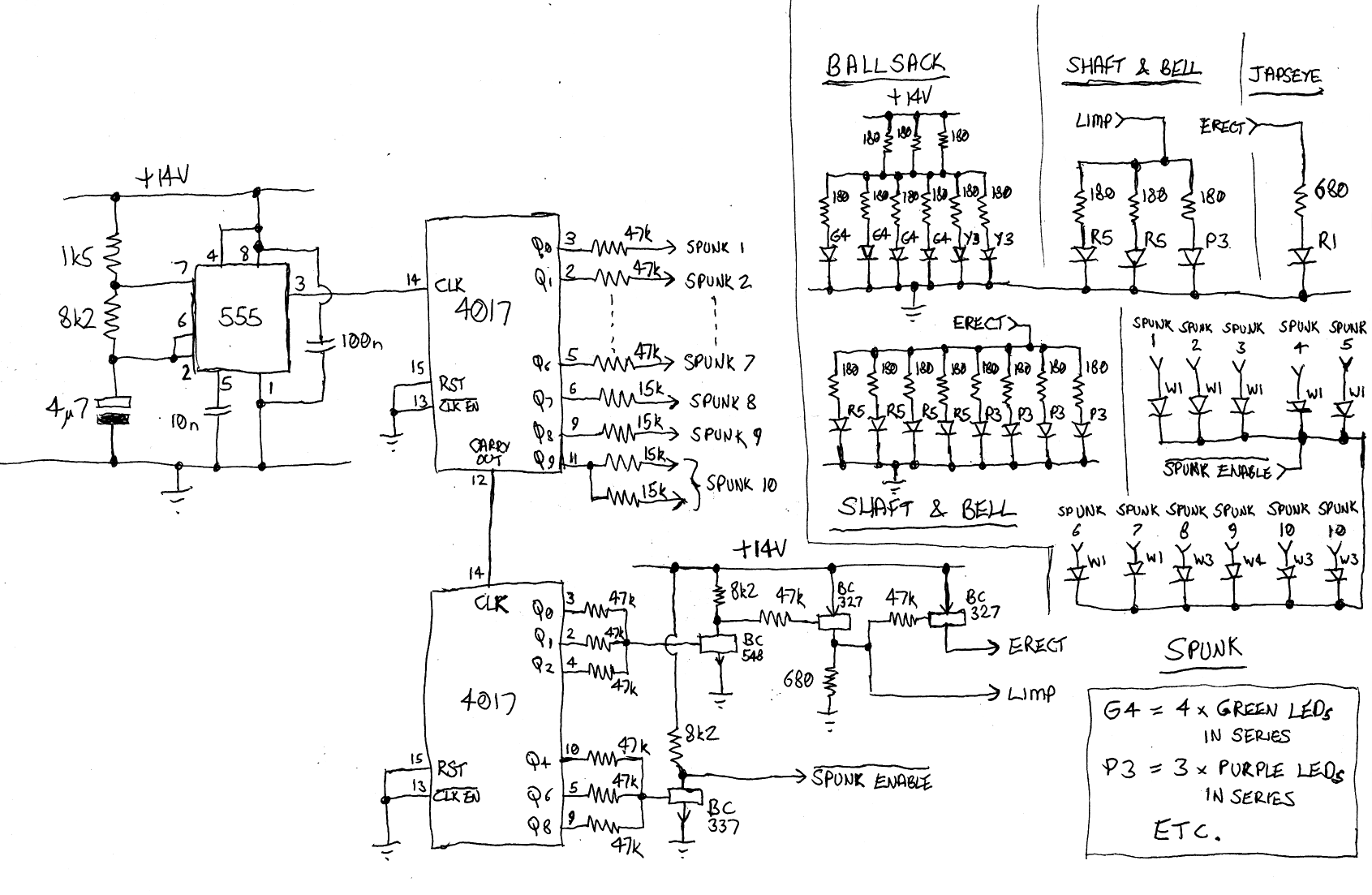 Outputs Q4, Q6 and Q8 are ORed in a similar manner to provide the !SPUNK_ENABLE signal. When any one of them is high the BC337 is turned on and provides a ground for the spunk LEDs. This provides three spurts of spunk with a pause between them. The pull-up resistor on this line is necessary because the cardboard on which the LEDs are mounted turned out to be a sufficiently poor insulator that without it the ridiculously-sensitive white LEDs would still glow dimly when they were not supposed to.