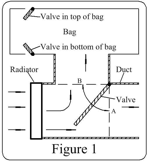 Figure 1 shows how the air from the radiators can be directed into the bag, to raise the temperature of the air in the bag. The pressure in the bag is maintained at ambient pressure by a pressure relief valve releasing air from the top of the bag, so the density of that air is decreased, and the bag becomes buoyant.