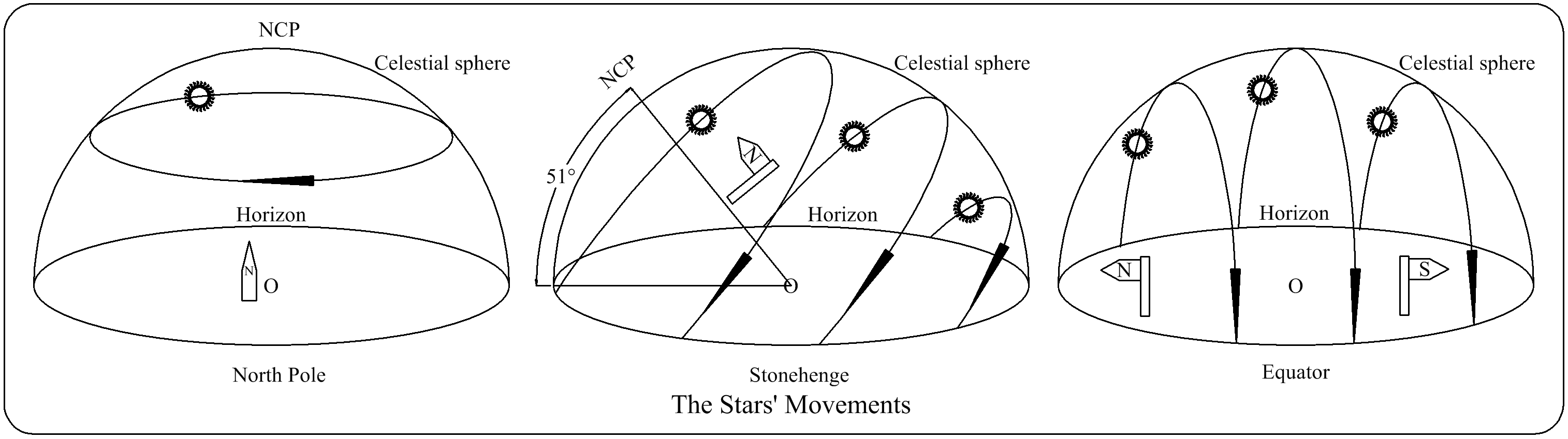 Before moving on, notice how the stars apparently move; knowing what to expect helps one to understand. The Earth rotates around an axis defined by the North & South Poles. An observer at a pole will see the stars apparently rotating around the pole. As the obsever travels toward the equator the stars' apparent movement will change: the drawing shows how.