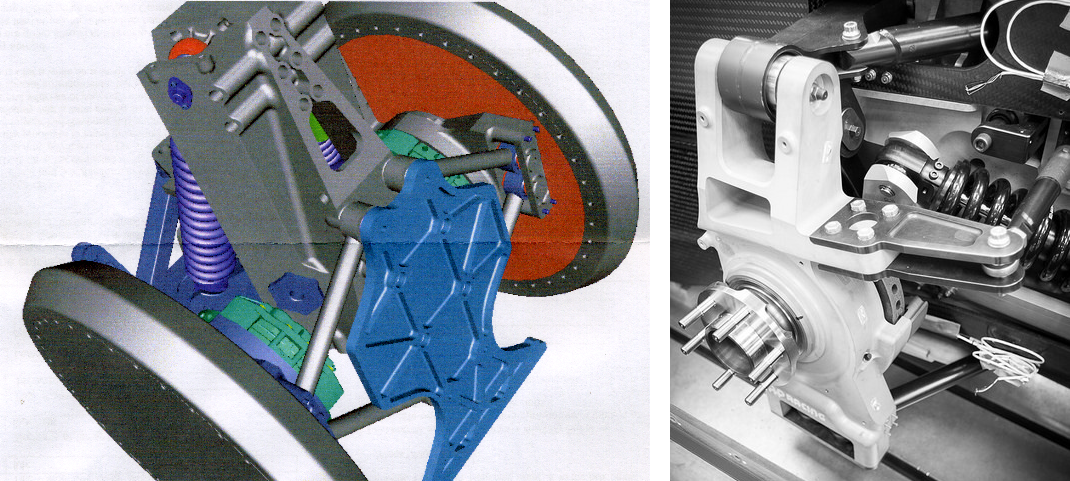 But, looking at the Genome, there is no axis. In the picture below, on the right, can be seen the steering rack output shaft connected to the upright, & the upper suspension member connected to the upright. Perhaps the latter connection is a spherical joint - in which case so far so good - but on the left the picture from the Genome shows the two lower suspension members mooring the upright to the chassis in such a manner that the upright cannot turn.