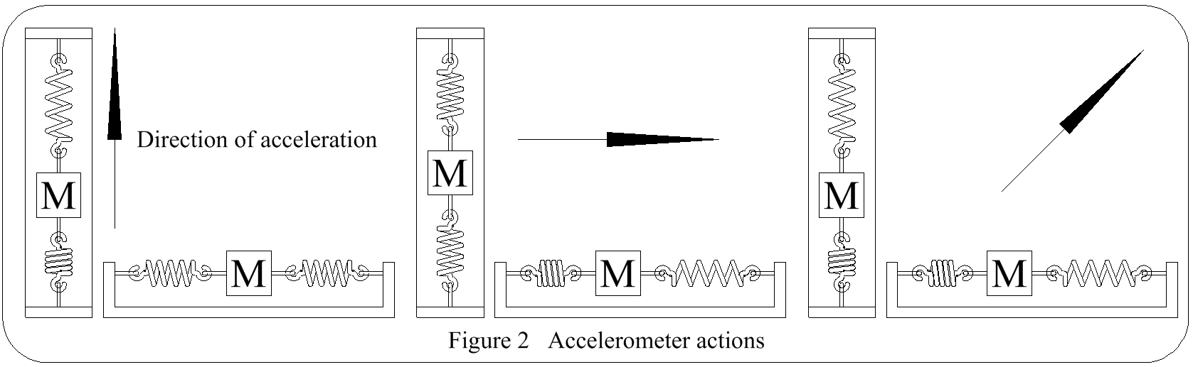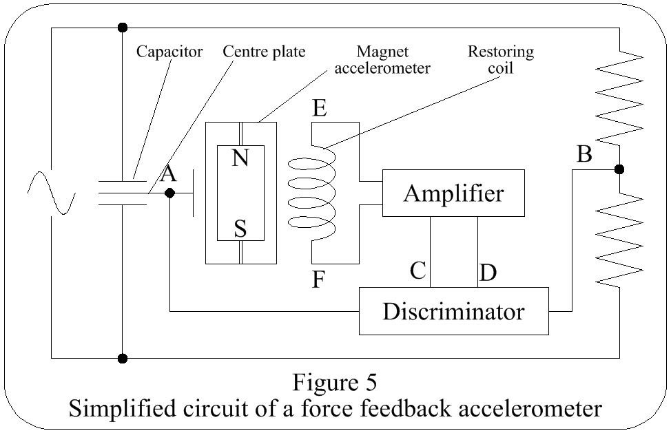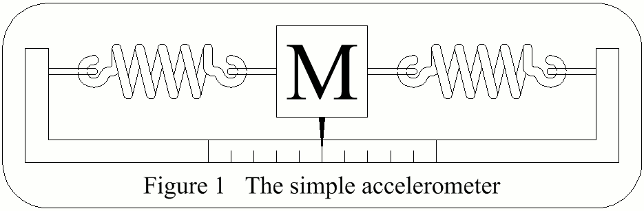 Referring to Figure 1, the mass will be displaced left if the acceleration is to the right. The force required to displace the mass is provided by the acceleration & that force will be balanced by the spring causing the mass to stop moving. Thus the force produced by the acceleration & the displacement of the pointer from zero, is proportional to the acceleration.
