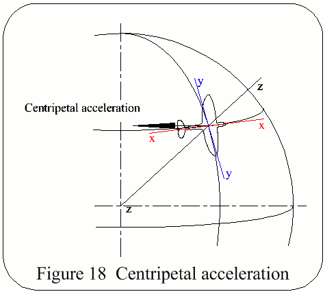 Referring to Figure 18, it can be seen that for a vehicle travelling in an E/W path the centripetal acceleration will affect the outputs of the x, y, z accelerometers, if not in line with one of these axes, in proportionate amounts to the o/ps of those accelerometers, being maximum at the equator & minimum at the poles. Similar errors will occur if the vehicle travels on a N/S path.