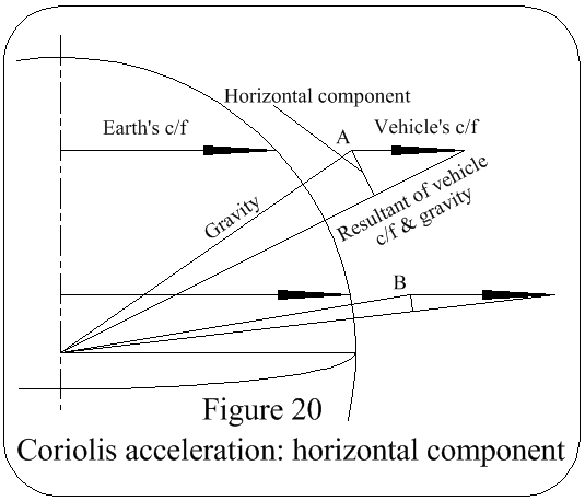 Horizontal Component: Referring to Figure 20, the resultant of the vehicle's coriolis force & gravity effect, which will vary in amount with latitude change, being smallest at the equator & becoming greater towards the poles, causes a deflection to the right of the vehicle in the Northern hemisphere & to the left in the Southern hemisphere.