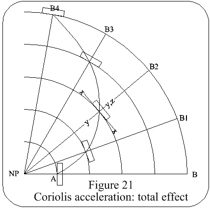 Total Effect Of Coriolis: Referring to Figure 21, the vehicle must travel in a curved path from A to B due to the movement of the arrival point from B to B4 caused by the earth's rotation; at the same time, due to the curved path, the x, y, z axes move relative to space & produce unwanted errors. Correcting signals, which vary with latitude, altitude & vehicle speed are supplied from the computer & fed to the relevant accelerometers.