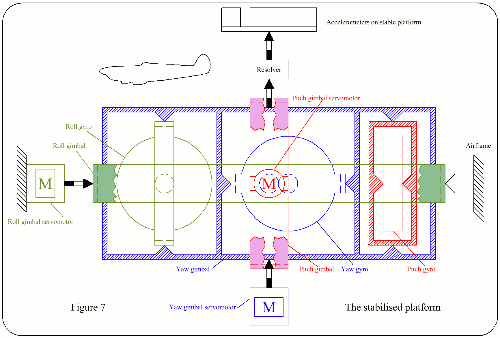 The platform must be stabilised in space & be capable of controlled movement as required. This alignment is made continuously, by turning, or precessing, the accelerometer frame at certain computed rates. For correct operation, the accelerometer platform must be completely independent of the vehicle pitch, roll & yaw motion. If the platform is mounted in gimbals, & gyros used to detect movement of the platform from its datum position, the gyros' o/ps can be employed to eliminate errors from the platform alignment.