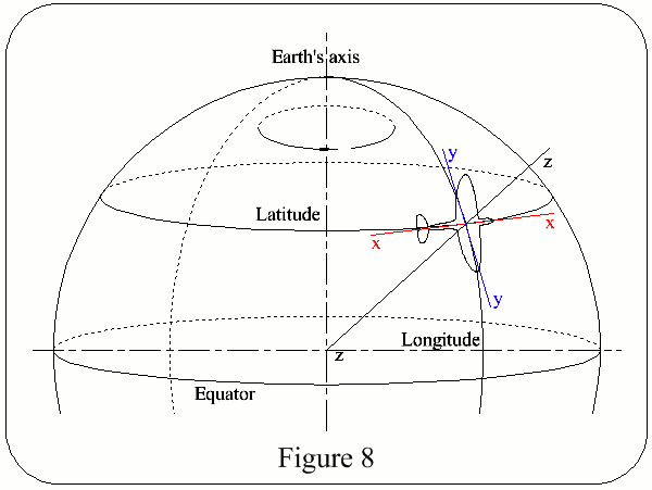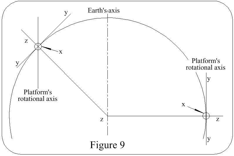 To correct for this error the platform must be turned relative to a fixed point in space, in the same direction & at the same angular velocity as the Earth, ie 15°/h, about an axis parallel to the Polar axis, see Figure 9, & also if the platform is to remain aligned with the local x, y, z axes it must move with the Earth & in the same direction as the Earth. Thus movement must take place about the y axis to maintain the local vertical & about the z axis to maintain heading.