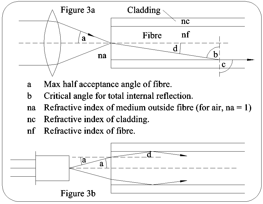 When b = critical angle: sin b / sin c = nc / nf c = 90° so sin c = 1 sin b = nc / nf sin b = cos d = nc / nf nc / nf = √(1 - sin2d) nc2 = nf2(1 - sin2d) sin a / sin d = nf / na sin2d = na2.sin2a / nf2 nc2 = nf2(1 - na2.sin2a / nf2) nc2 = nf2 - ns2.sin2a sin2a = (nf2 - nc2) / na2 sin a = √[(nf2 - nc2) / na2] = NA For air: sin a = √(nf2 - nc2) = NA So for total internal reflection a < sin-1√(nf2 - nc2)