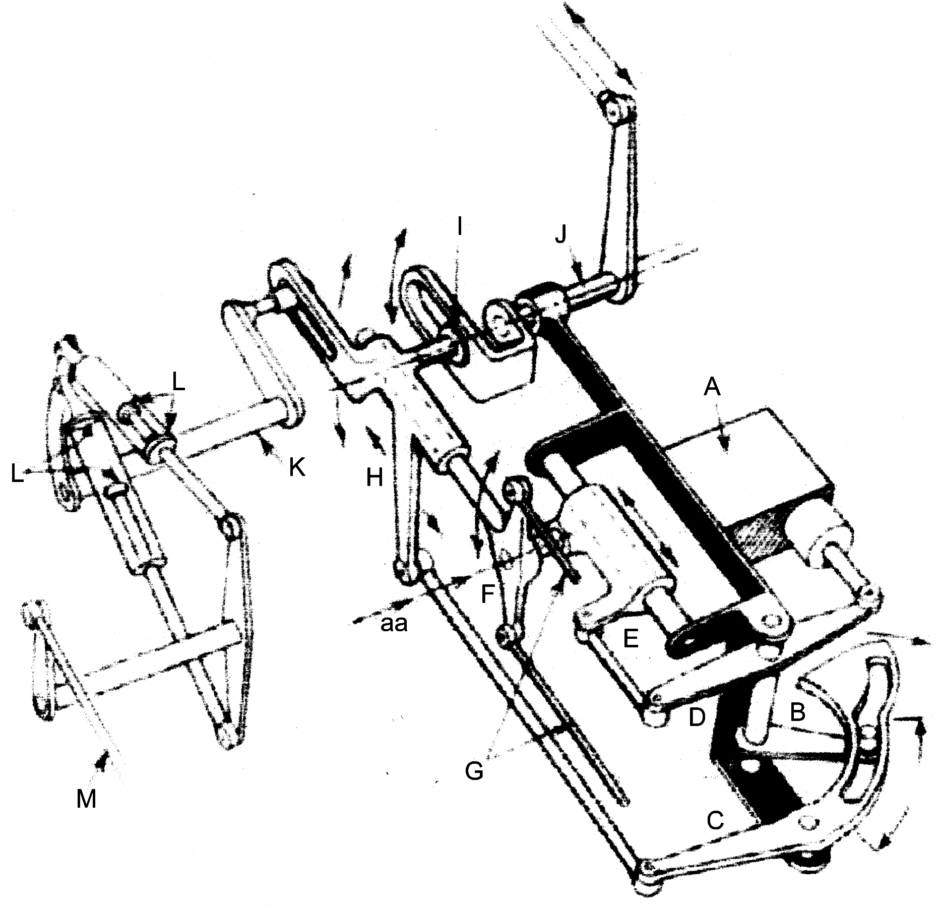 Further movement of the actuator, out of cruise condition, moves B to the effective track of C. The resulting displacement of C & the attached link moves slider H. Roller I is moved off the centre line of the rudder movement input shaft J. Rudder movement then swings I & H about pivot aa, moving G differentially. The more B moves along the effective sector, the more I is moved off the centre line of J, & the more differential pitch is increased.