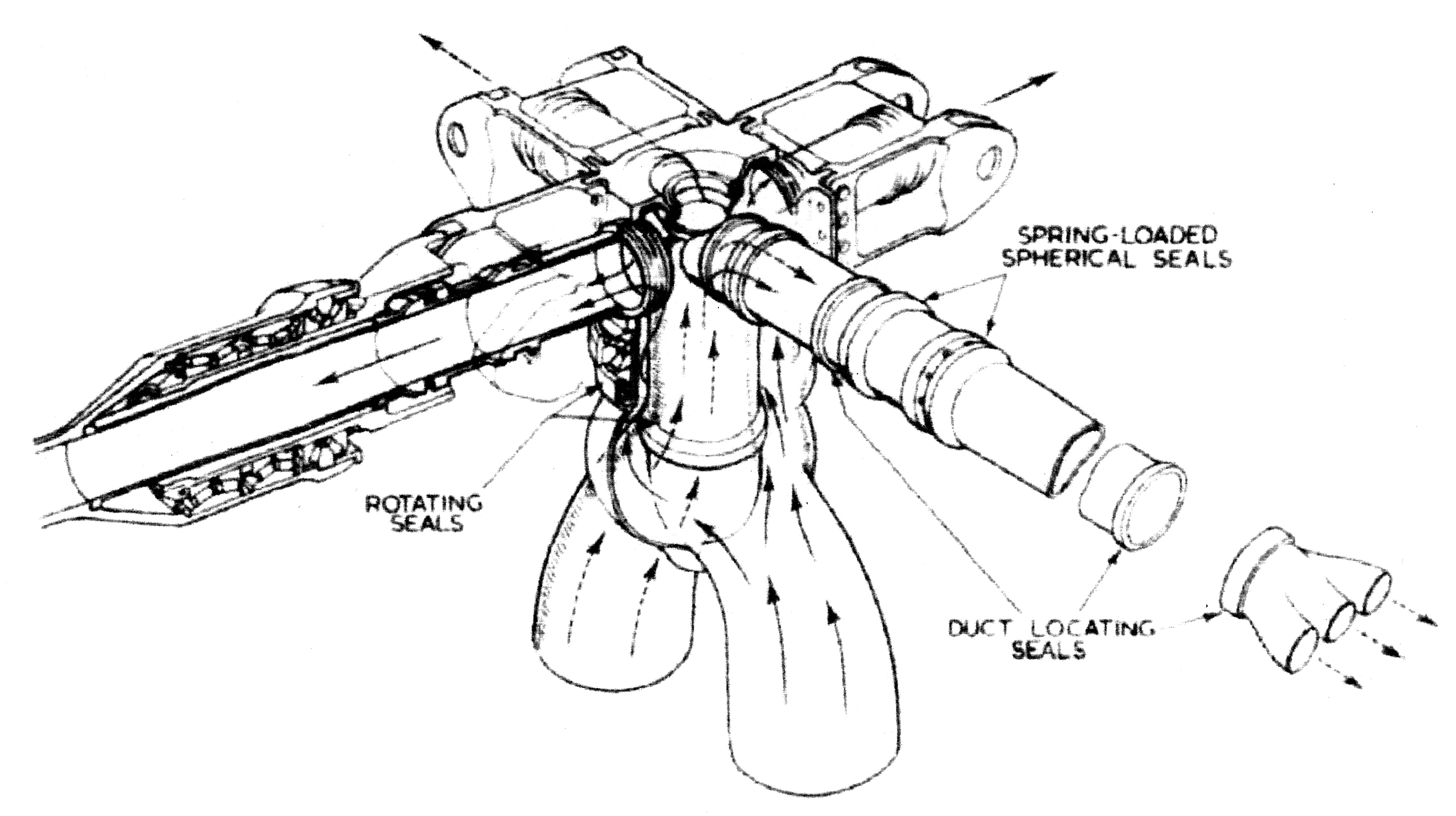 The sketch indicates some of the sealing problems involved in leading pressurized air at 250°C through flexing ducts. Note also the spar-root taper roller bearings.