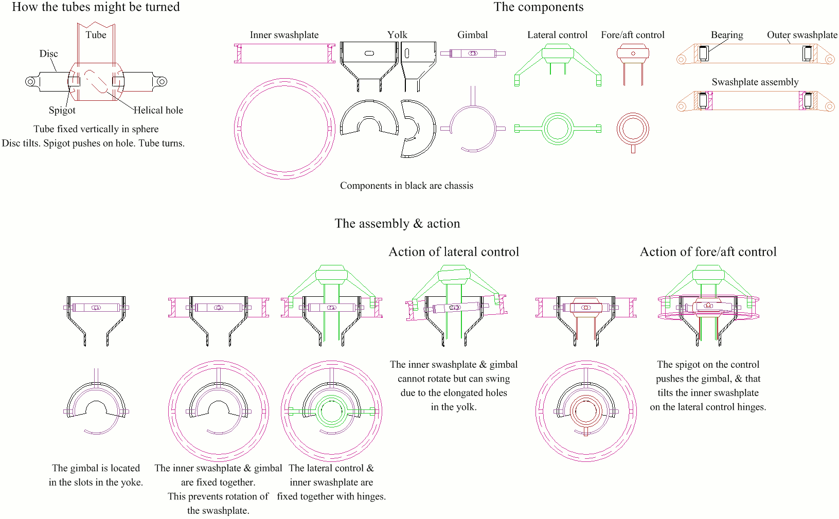 Collective pitch is obtained by both upper jacks moving in the same sense. The inner tube is splined to allow this vertical movement of outer tube & spider.