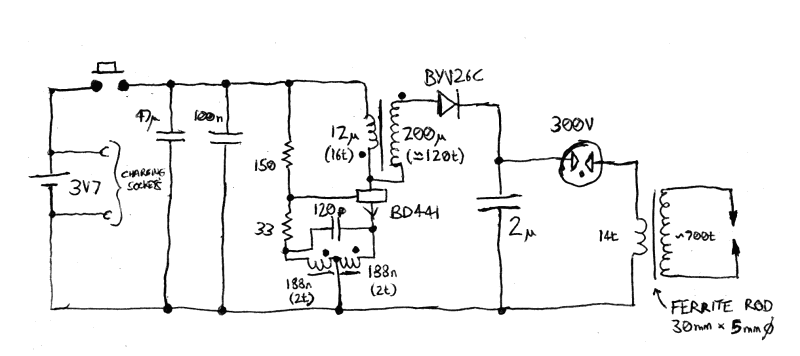The BD441 transistor was selected for adequate collector voltage and current capacity, good gain and speed, and availability. The connection of the low voltage end of the secondary winding to the transistor collector, rather than to ground, is important for the purpose of eating the switch-off spikes on the collector to keep within its rating. The BYV26C diode was selected for high switching speed, voltage rating, and availability. Use of a high speed diode is important given the hundreds-of-kHz operating frequency.