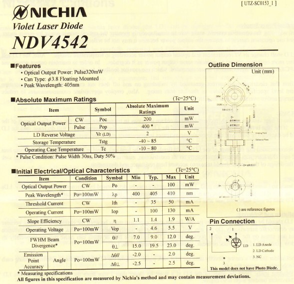 The purpose of this page is to provide useful information to anyone interested in fucking around with a Nichia NDV4542 405nm 100mW laser diode.