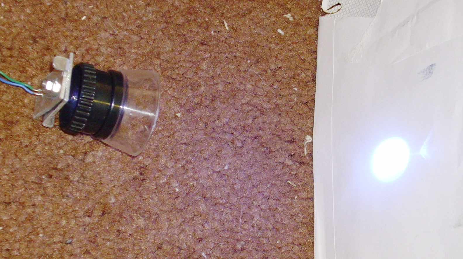 ...What that really is is the result of focussing the beam down to a much smaller spot while aimed at the same old-envelope screen, so it has burnt a hole through the front layer of the envelope and is reflecting off the inside.