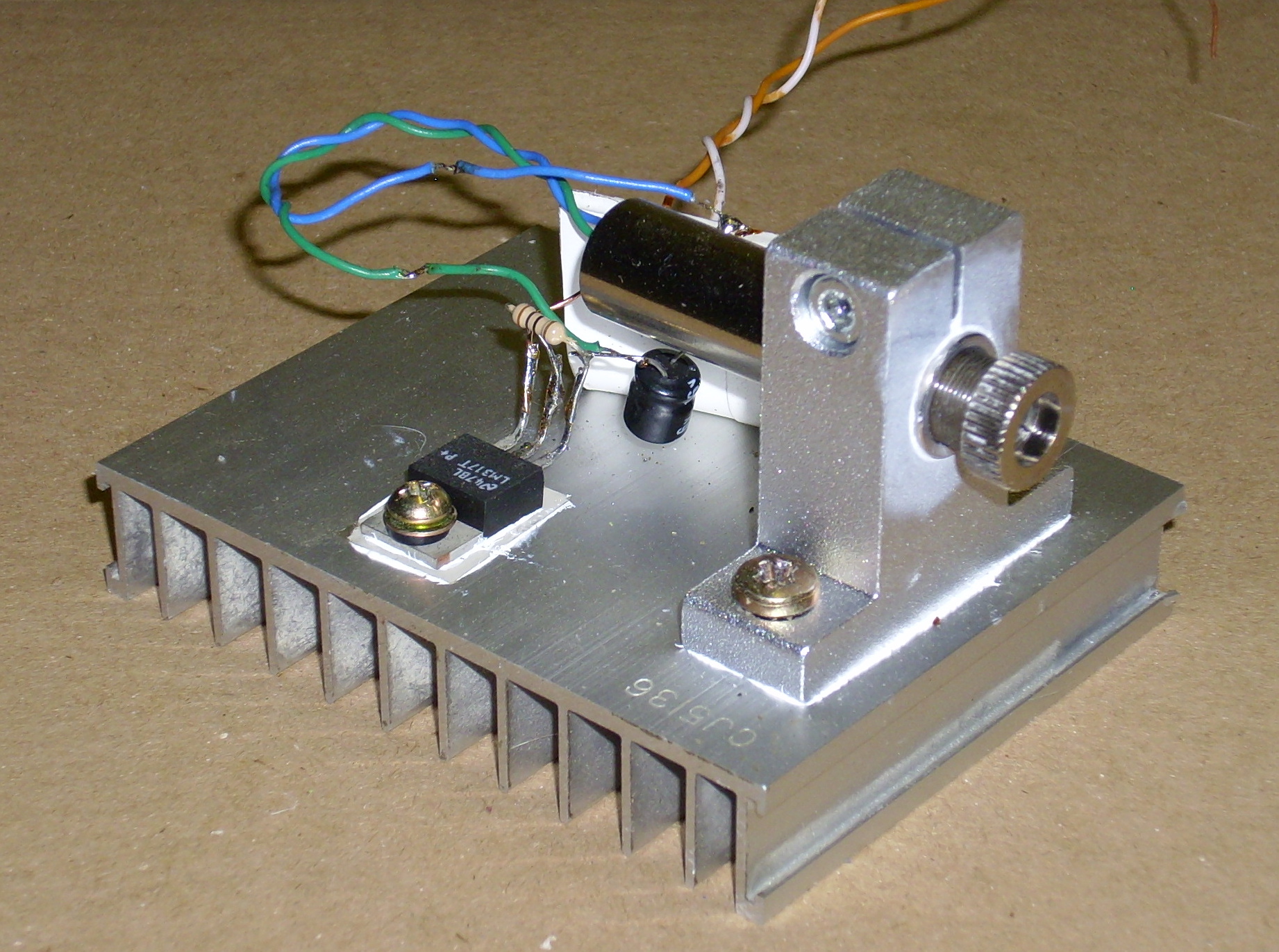 Since then I have mounted it in a cylindrical chrome-plated brass holder with an adjustable 3-element glass lens AR-coated for 405nm. The diode is supposed to be a press fit into a little well inside the holder; unfortunately the well was not very well machined, and while it is a press fit around the lip of the well, the diameter of the well increases inside and the diode is a bit loose and wobbly when fully inserted. I managed to hold it more firmly in place by means of a combination of a spring and various washers and spacers I had lying around, compressed between the back of the diode and the inside of the back of the housing. The housing is then mounted in a clamp which is bolted to a heatsink out of a dud monitor; the heatsink also carries the LM317 and a bracket to attach the power supply wires. All interfaces between the diode and the heatsink are coated with heatsink goo, and the rough finish of the clamp was filed smooth on the bottom surface. The housing, lens and clamp were all supplied by Odic Force.