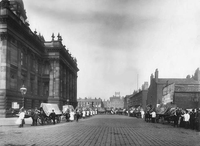 Underneath we have the least perbuggered version that seems to be around, but it's still kind of dodgy. It's supposed to be Bolton's tank bank, and it even almost looks right - Bolton town hall in the horse and cart era did have flags and lanterns in front of it resembling those on the postcard. But it also had a kerb, not just the flags raggedy-edging straight onto the dirt, and that lantern does look rather like someone's blanked the real lantern out and then tried to draw in a Bolton-style one by hand, and got it slightly on the piss. (Or maybe they couldn't be arsed to blank out neatly around it and just painted over it and then drew it back in again because it was easier that way. I don't bloody know.) And if it really was in Bolton, why bother buggering the photo up so much instead of just using it as is?