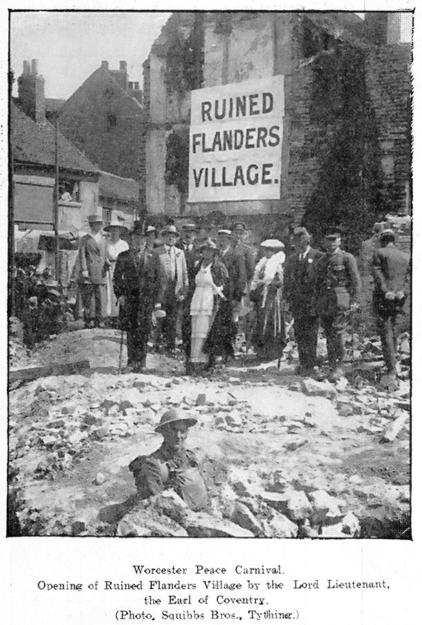 In the aftermath of WW1, Worcester "adopted" Gouzeaucourt, one of the villages on the Somme battlefield destroyed in the war, to help it rebuild, apparently largely by dumping the surplus production of various Worcester manufacturers on it. (The original plan was to adopt Gheluvelt, naturally, but Gheluvelt held out for actual bricks and mortar and sweat, which was deemed too expensive, so they picked somewhere else beginning with G instead.) In order to raise funds for this, they designated the Glover's Arms demolition site a "Ruined Flanders Village" and charged people to look round it. Look, they even dug a little trench and put a soldier in it. It sounds like a kind of sick joke, but they had some fucking weird ideas back then (like excluding soldiers from the peace celebrations) and it seemed like a good enough plan that a few other towns also independently had the same idea, although I don't think anywhere else made the site by driving a tank through the middle of town.
